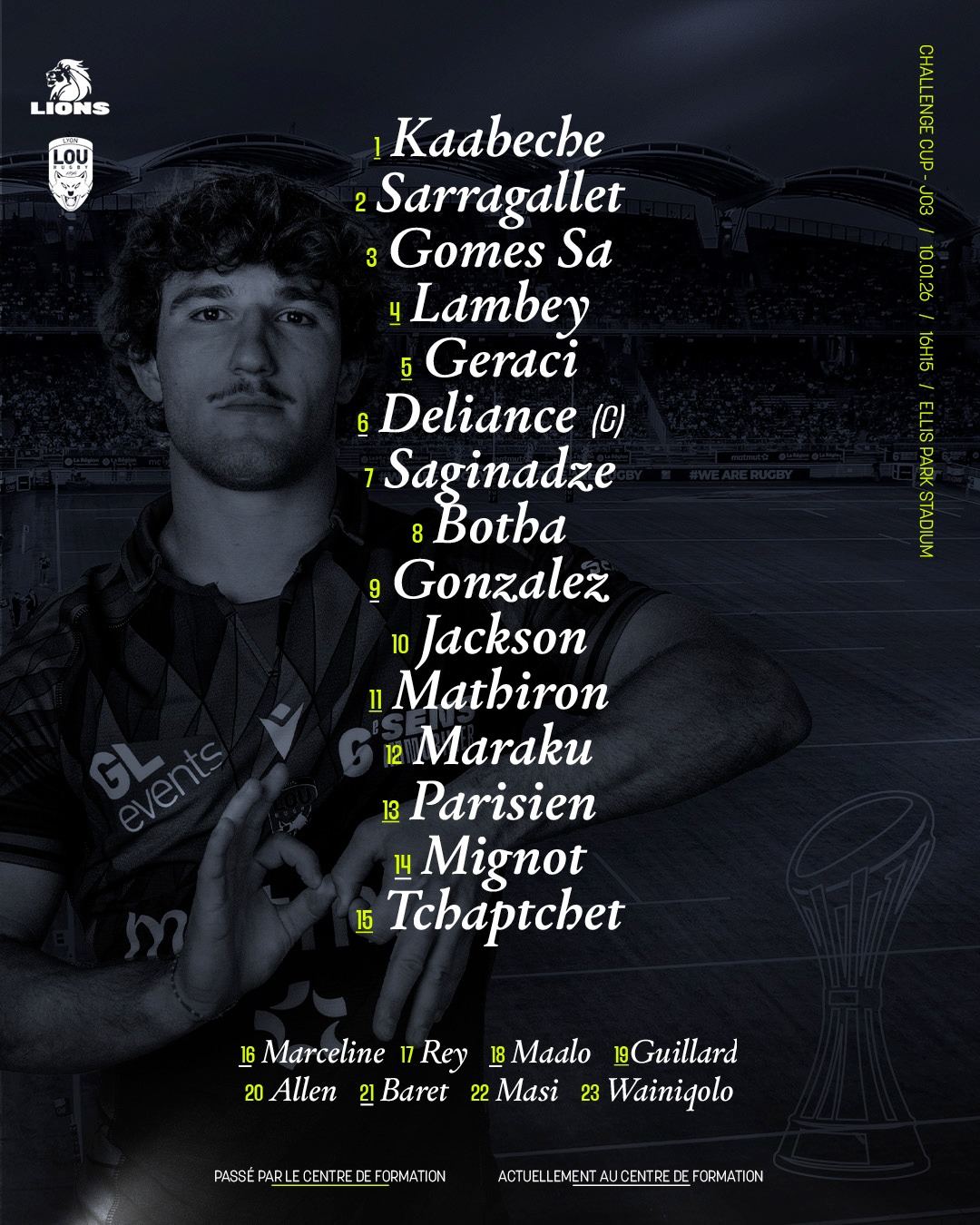 Découvrez la liste des 23 joueurs qui défendront les couleurs du LOU face aux Emirates Lions, ce samedi 10 janvier à 16h15 sur la pelouse de l'Ellis Park Stadium.