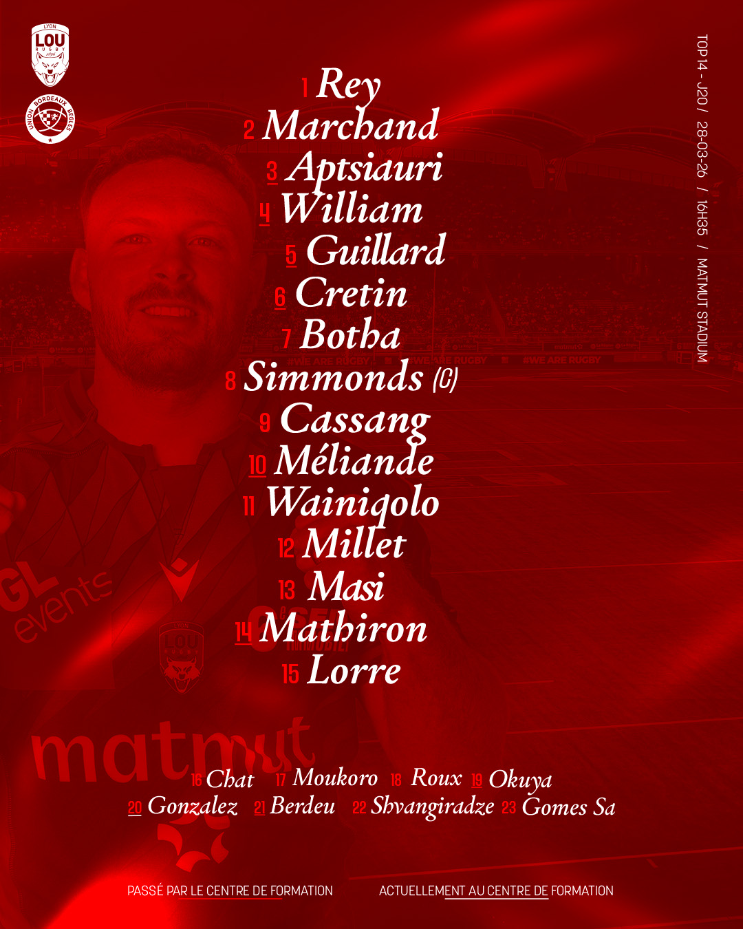 Découvrez la liste des 23 joueurs qui porteront les couleurs du LOU Rugby pour la réception de Bordeaux, ce samedi 28 mars à 16h35.