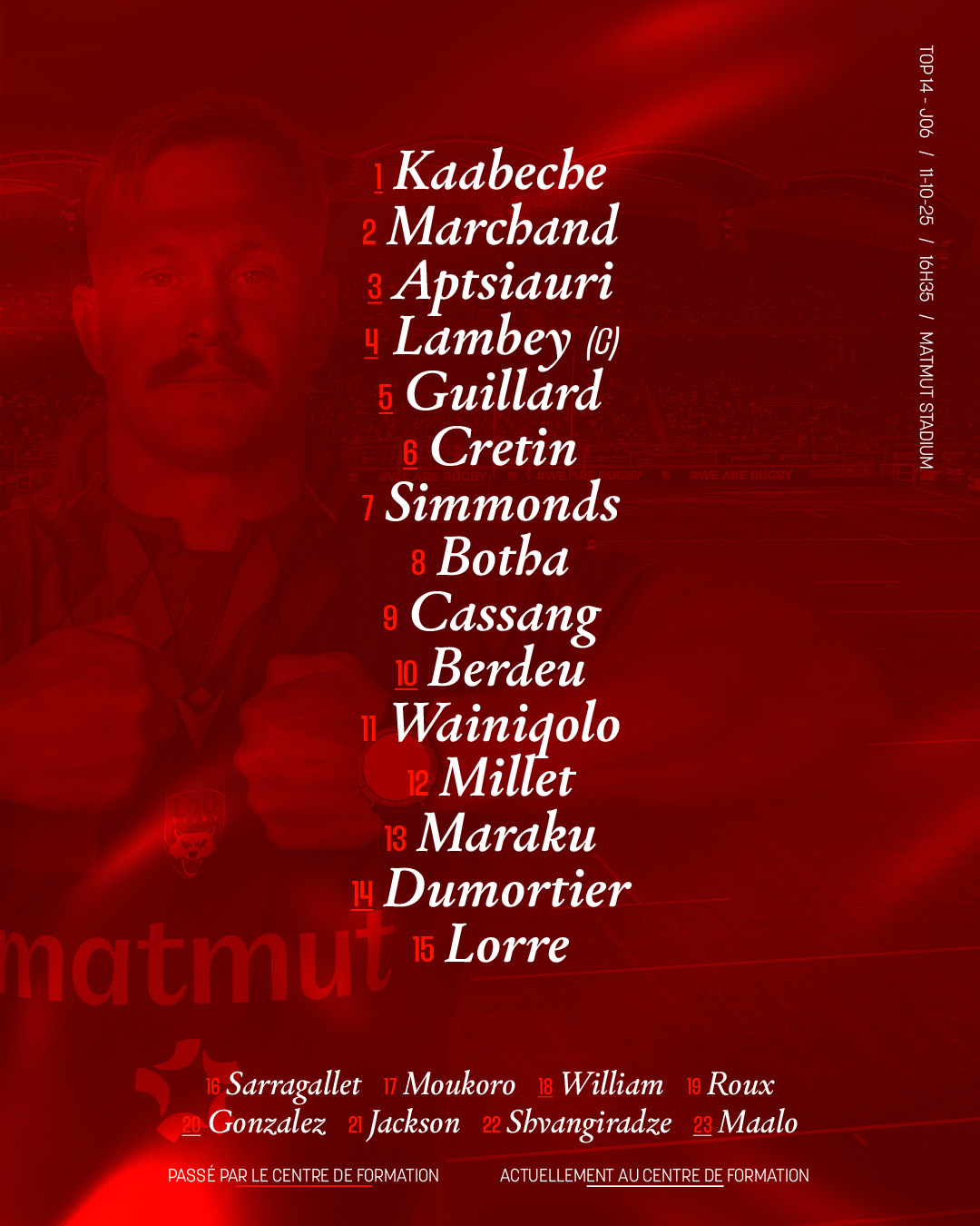 Découvrez la liste des 23 joueurs retenus pour affronter l'USA Perpignan, ce samedi 11 octobre à 16h35 au Matmut Stadium.