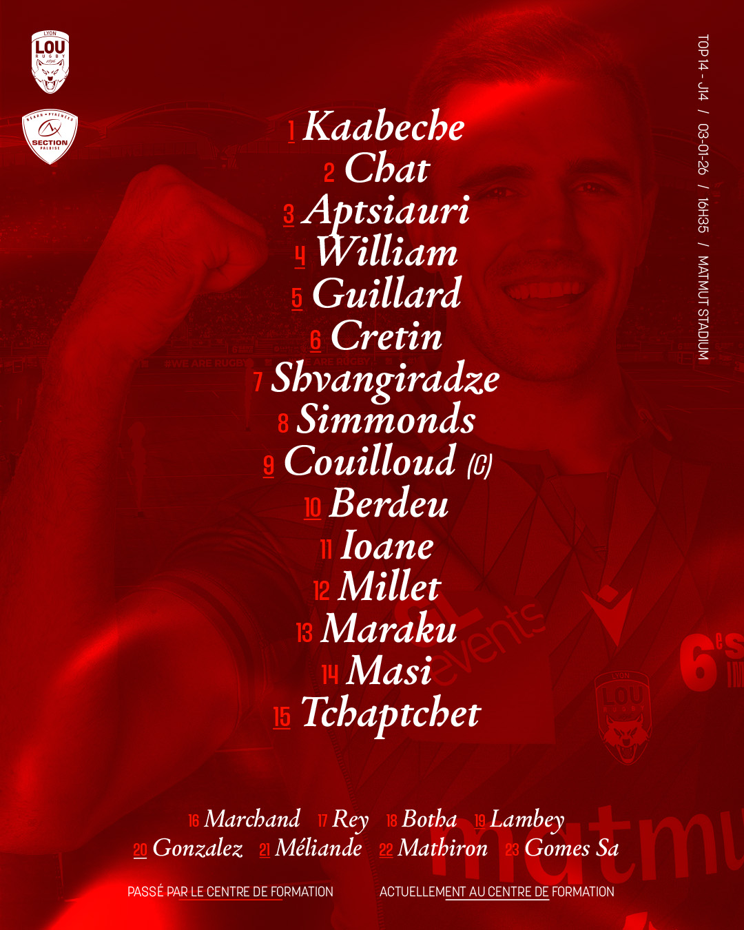 Découvrez la liste des 23 joueurs qui défendront les couleurs du LOU Rugby, ce samedi 3 janvier face à la Section Paloise.